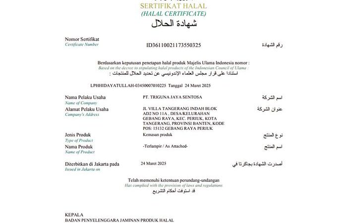 - SERTIFIKASI HALAL: Nomor Sertifikat Halal ID: 36110021173550325.