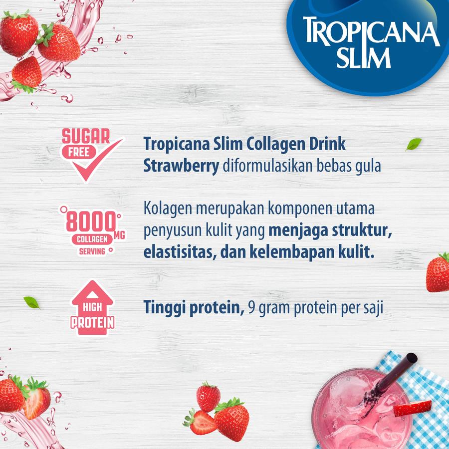 Tropicana Slim Collagen Drink Strawberry adalah minuman kaya kolagen dengan 8.000 mg kolagen dan 7 vitamin esensial, diformulasikan khusus tanpa tambahan gula. Produk ini membantu memenuhi kebutuhan harian kolagen serta vitamin, terutama vitamin C (100% AKG) dan vitamin A, yang penting untuk menjaga kesehatan dan elastisitas kulit.