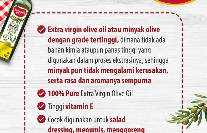 Tropicana Slim Extra Virgin Olive Oil adalah pilihan tepat untuk mendukung gaya hidup sehat Anda. Sebagai minyak zaitun dengan grade extra virgin, produk ini dihasilkan dari ekstraksi alami tanpa menggunakan bahan kimia atau panas tinggi, sehingga menjaga kualitas, cita rasa, dan aroma alami buah zaitun tetap sempurna.