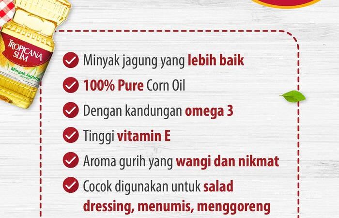 Tropicana Slim Minyak Jagung adalah pilihan cerdas untuk memasak sehari-hari. Terbuat dari 100% minyak jagung pilihan, produk ini dirancang khusus untuk mendukung gaya hidup sehat Anda. Dengan kandungan lemak jenuh yang rendah dan diperkaya dengan Omega-3 serta Vitamin E, minyak ini membantu menjaga kesehatan jantung dan menurunkan kadar kolesterol.
