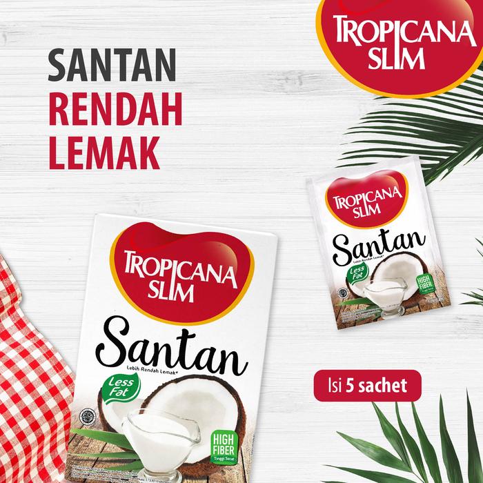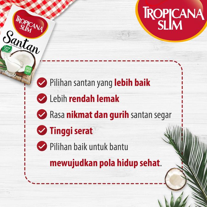 Nikmati santan gurih dengan manfaat lebih sehat! Tropicana Slim Santan Less Fat terbuat dari kelapa pilihan, rendah lemak, dan tinggi serat. Cocok untuk diet, penderita diabetes, hipertensi, atau siapa pun yang ingin hidup lebih sehat tanpa mengorbankan rasa.