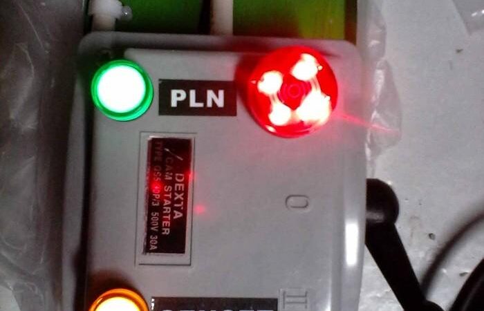 - Saat PLN hidup → lampu indikator hijau menyala & alarm berbunyi → pindahkan tuas ke posisi PLN & matikan genset.