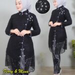 Set ini terdiri dari tunik atasan brokat dan rok plisket karet. Atasan terbuat dari bahan Brokat Cornellie berkualitas tinggi yang sudah dilengkapi dengan furing dalaman dari Hyget Super, sehingga menjamin kenyamanan dan tidak gatal saat dipakai. Model payet miring dan lengan panjangnya menambah kesan glamor. Roknya terbuat dari Katun Silky yang teduh, tidak menerawang, dan memiliki kerutan karet yang nyaman.