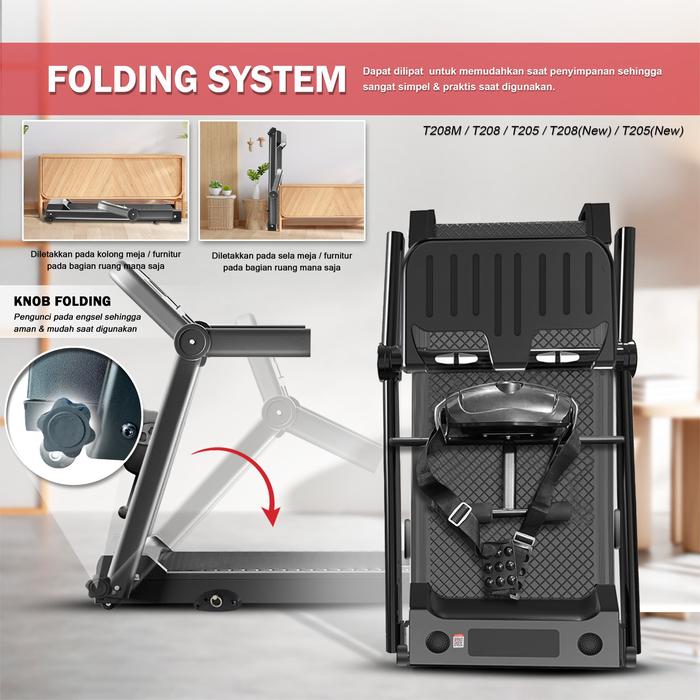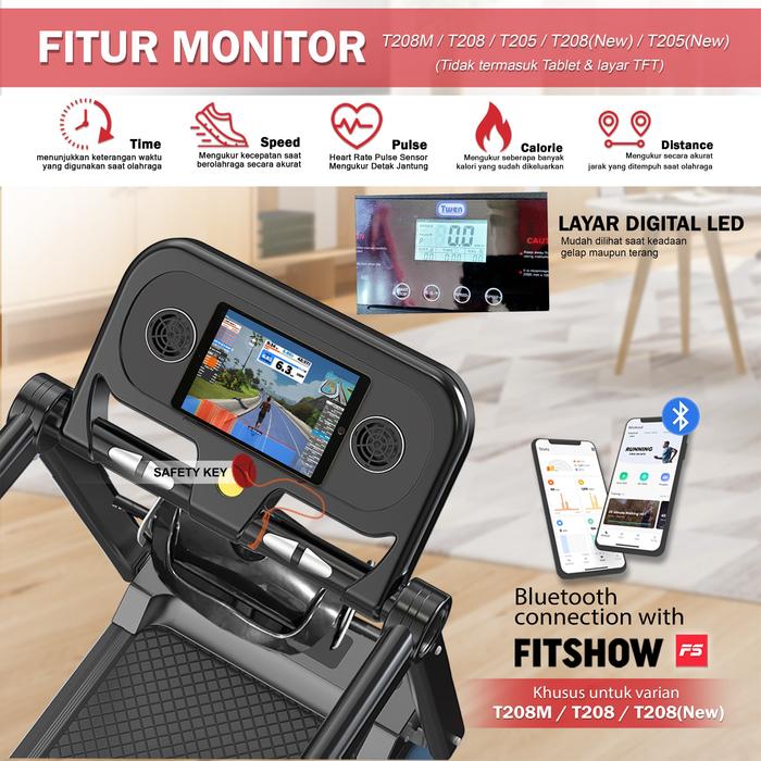 T208 / T208mLengkap dengan Aplikasi & Speaker Bluetooth! Lacak progress dan dengarkan musik langsung dari treadmill.
