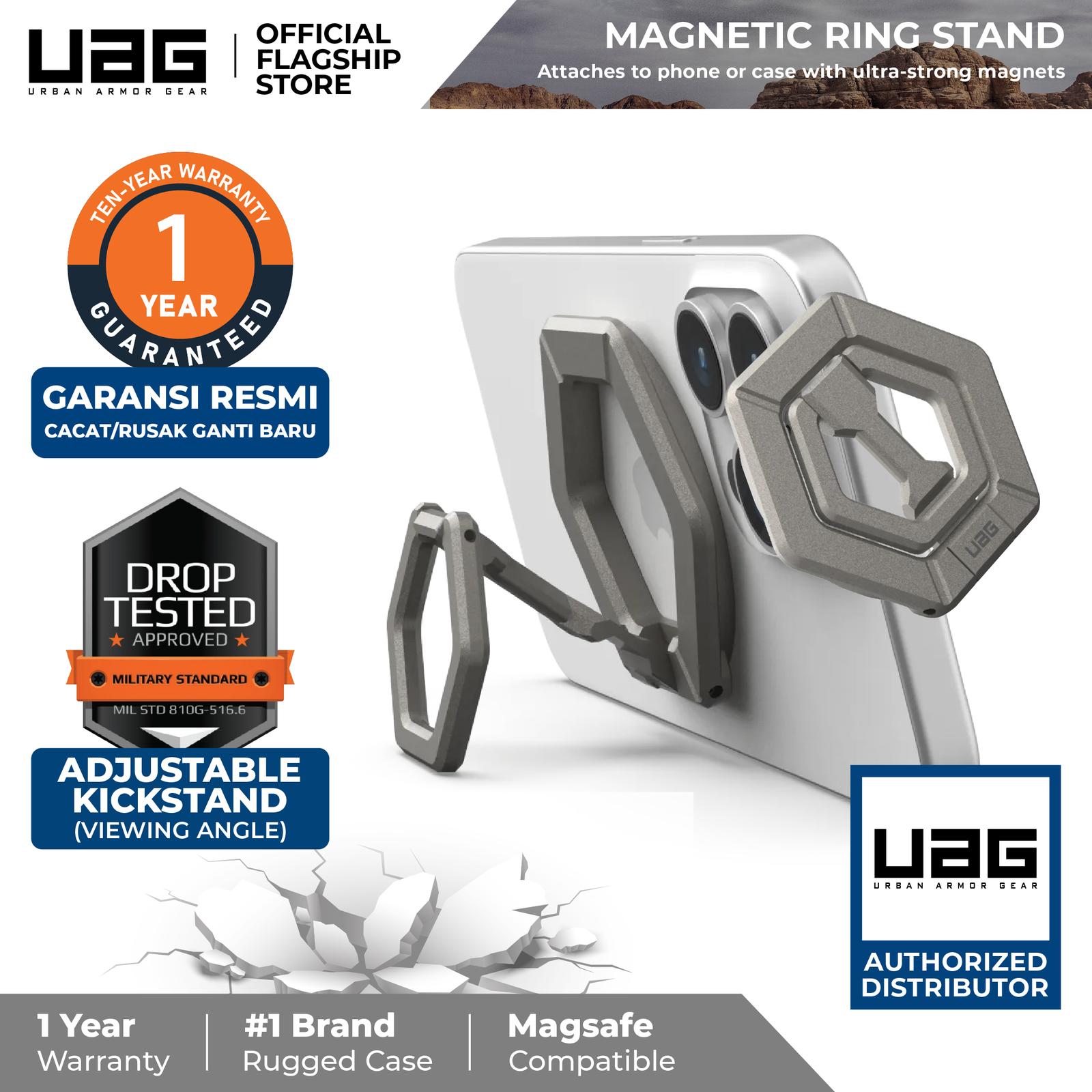 Temukan aksesori revolusioner yang mengubah cara Anda menggunakan iPhone! UAG Magnetic Ring Stand kompatibel dengan MagSafe hadir dengan magnet super kuat yang memastikan keamanan maksimal, baik dipasang langsung di iPhone atau melalui case MagSafe. Cincinnya dapat diputar 360 derajat untuk kenyamanan genggam satu tangan saat mengetik, menjelajahi media sosial, atau mengambil foto. Jadikan sebagai kickstand untuk menonton video hands-free dalam mode landscape atau mengambil selfie sempurna dalam mode portrait.