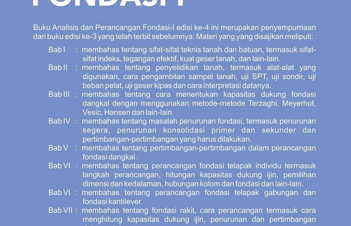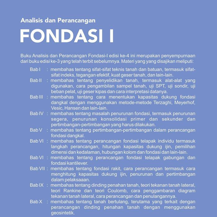 Buku ini membahas topik-topik fundamental hingga aplikatif secara detail, mulai dari sifat teknis tanah, penyelidikan tanah, hingga perancangan berbagai jenis fondasi. Setiap bab tidak hanya mengulas teori-teori terkini seperti metode Terzaghi, Meyerhof, dan Vesic untuk kapasitas dukung, tetapi juga dilengkapi dengan contoh soal aplikatif yang memudahkan pemahaman.
