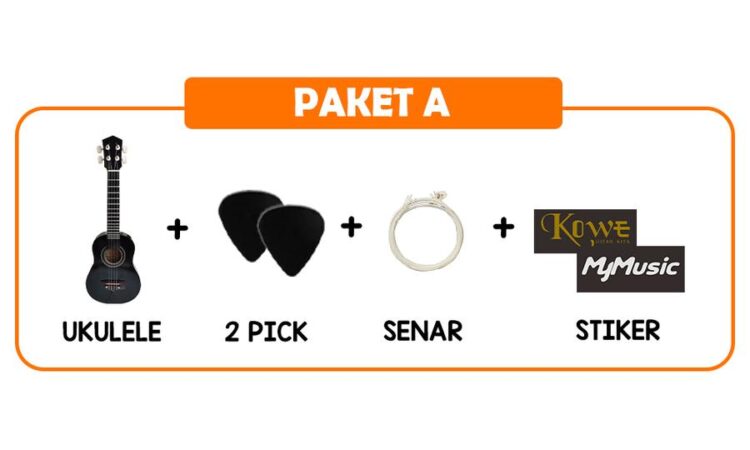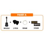 - Paket A: 1 Ukulele + Senar Terpasang + 2 Pick + Senar Cadangan + Stiker