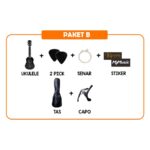 - Paket B: 1 Ukulele + Senar Terpasang + 2 Pick + Tas Ukulele + Capo + Senar Cadangan + Stiker