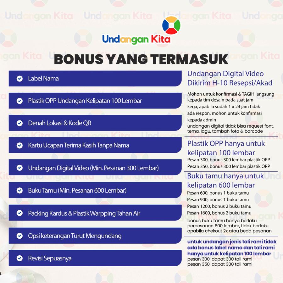 - Plastik OPP: Kemasan plastik bening untuk melindungi undangan.