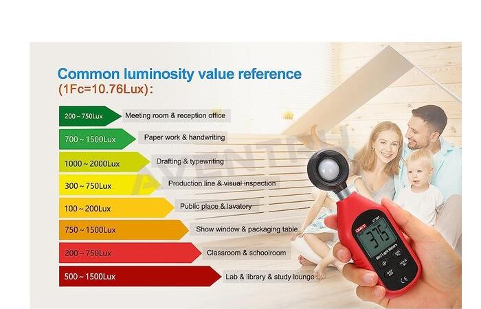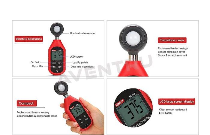 • FC (Foot-Candle): Satuan imperial untuk mengukur intensitas cahaya, sering digunakan dalam bidang arsitektur dan pencahayaan. 1 foot-candle kira-kira setara dengan 10.764 lux. Luxmeter UT383 dapat menampilkan hasil pengukuran dalam kedua satuan ini.