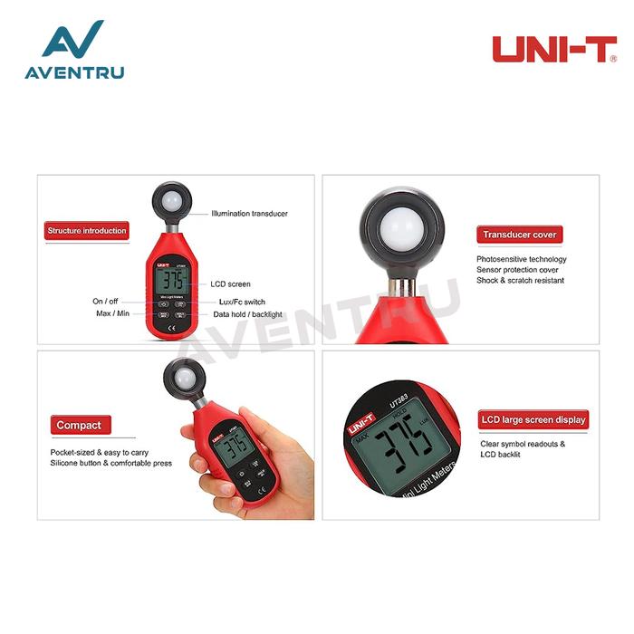 Dengan fitur seperti backlight, indikator baterai lemah, dan auto power off, UT383 menjamin kemudahan penggunaan dan efisiensi energi. Dapatkan alat yang andal untuk semua kebutuhan pengukuran pencahayaan Anda.