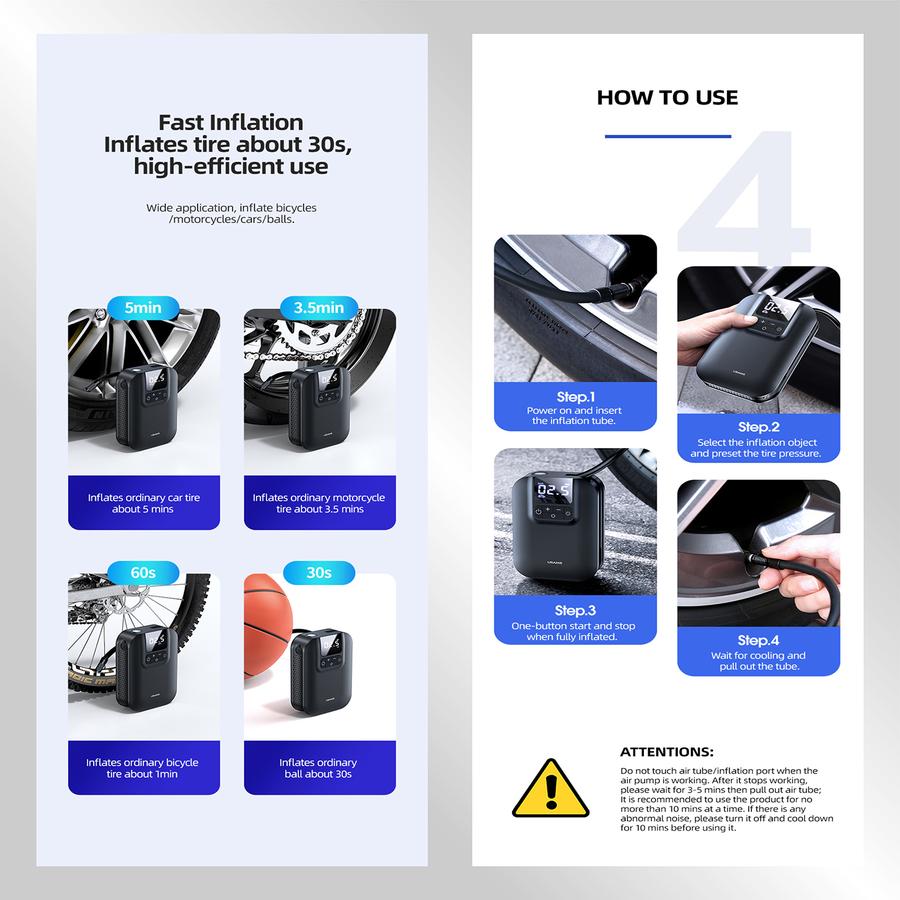 ✔ Auto Stop Cerdas – Berhenti otomatis saat tekanan ban tercapai, mencegah over-inflasi.