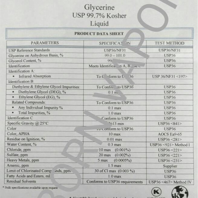 Dapatkan Vegetable Glycerin (VG) berkualitas tinggi dengan standar farmasi USP/EP. Produk ini sangat cocok untuk pembuatan liquid vaporizer, campuran makanan, dan kebutuhan farmasi lainnya. VG kami dijamin HALAL dan aman untuk dihirup (inhalasi) karena menggunakan standar pharmaceutical grade, bukan hanya food grade.