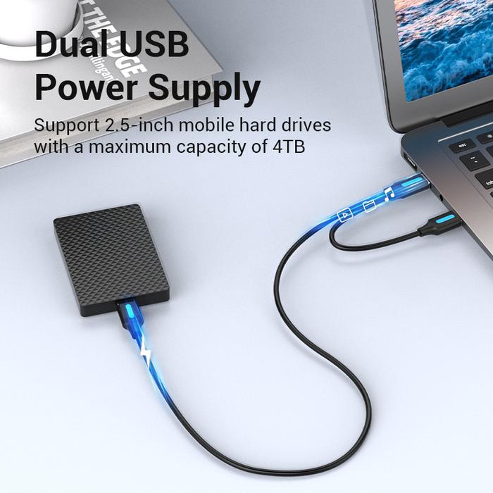 - Kabel Power Tambahan: Kabel USB 2.0 tambahan yang berfungsi menyediakan daya ekstra bagi hard disk yang membutuhkan lebih banyak power daripada yang dapat disuplai oleh port USB 3.0 tunggal.