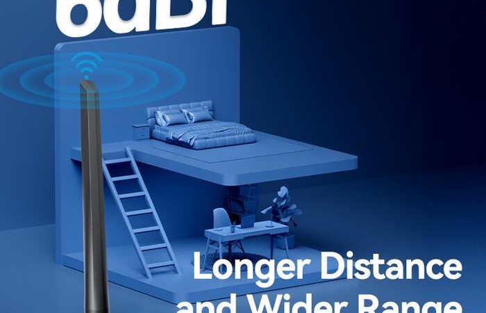 - 6dBi Antena High-Gain: Antena dengan penguatan sinyal lebih kuat dibanding standar (ukur dalam satuan decibel isotropic).