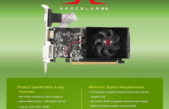 Dapatkan pengalaman komputasi visual yang lebih baik dengan VGA Card RX7 GT610. Kartu grafis low-profile ini adalah solusi hemat untuk upgrade PC Anda, menjadikannya ideal untuk penggunaan kantor, multimedia, atau sebagai cadangan.