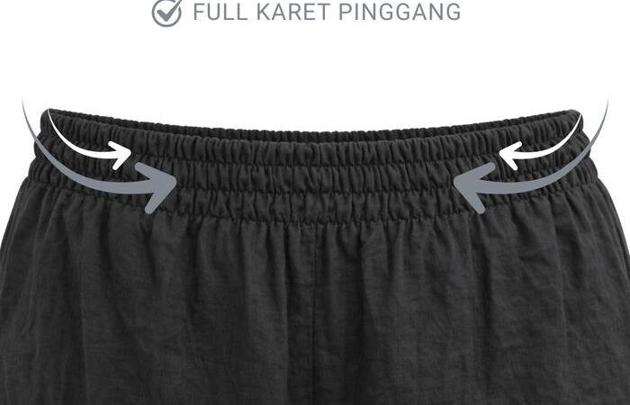 • Full Karet: Desain pinggang yang seluruhnya terbuat dari bahan karet elastis, memberikan kelonggaran maksimal dan mampu menyesuaikan berbagai ukuran pinggang.