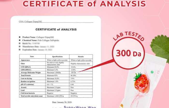 - Fish Collagen Tripeptide: Jenis kolagen yang berasal dari ikan dengan struktur molekul sangat kecil (tripeptida), sehingga mudah diserap tubuh dan lebih efektif dalam mendukung kesehatan kulit.