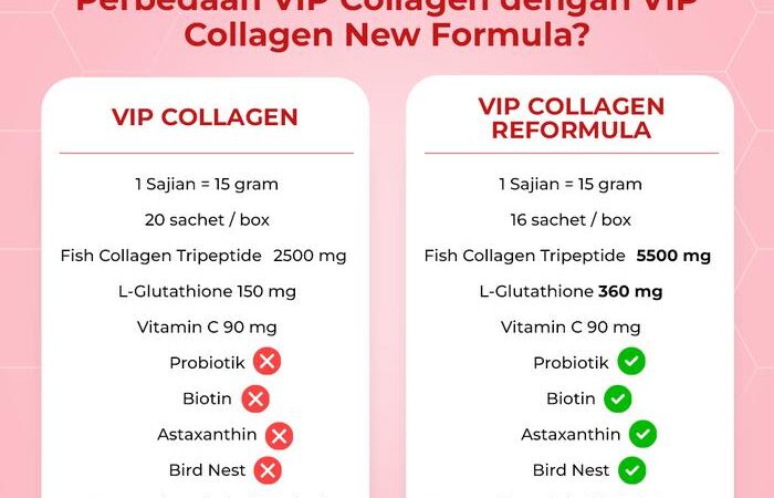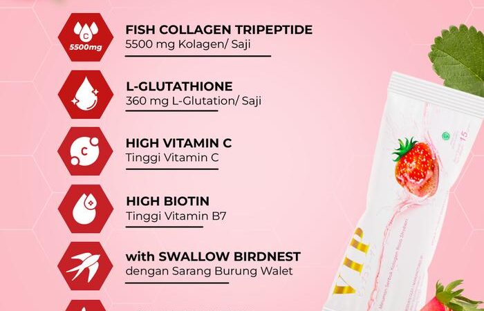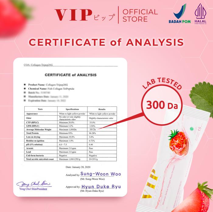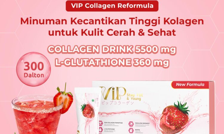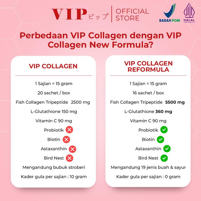 VIP Collagen Premium hadir dalam kemasan praktis 1 box berisi 20 sachet. Produk ini adalah minuman kolagen mutakhir yang diformulasikan dengan teknologi Jepang. Kandungan utamanya, Fish Collagen Tripeptide, memiliki molekul yang kecil sehingga penyerapannya 3x lebih cepat dan efisien dibandingkan kolagen biasa, memberikan hasil yang lebih maksimal untuk kesehatan dan kecantikan dari dalam.