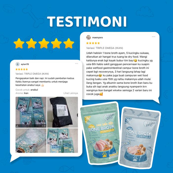 | Bone Broth Triple Omega (Fish) | Ekstrak tulang ikan, ikan gabus, dan tuna, kaya omega-3 untuk kulit dan bulu sehat. |