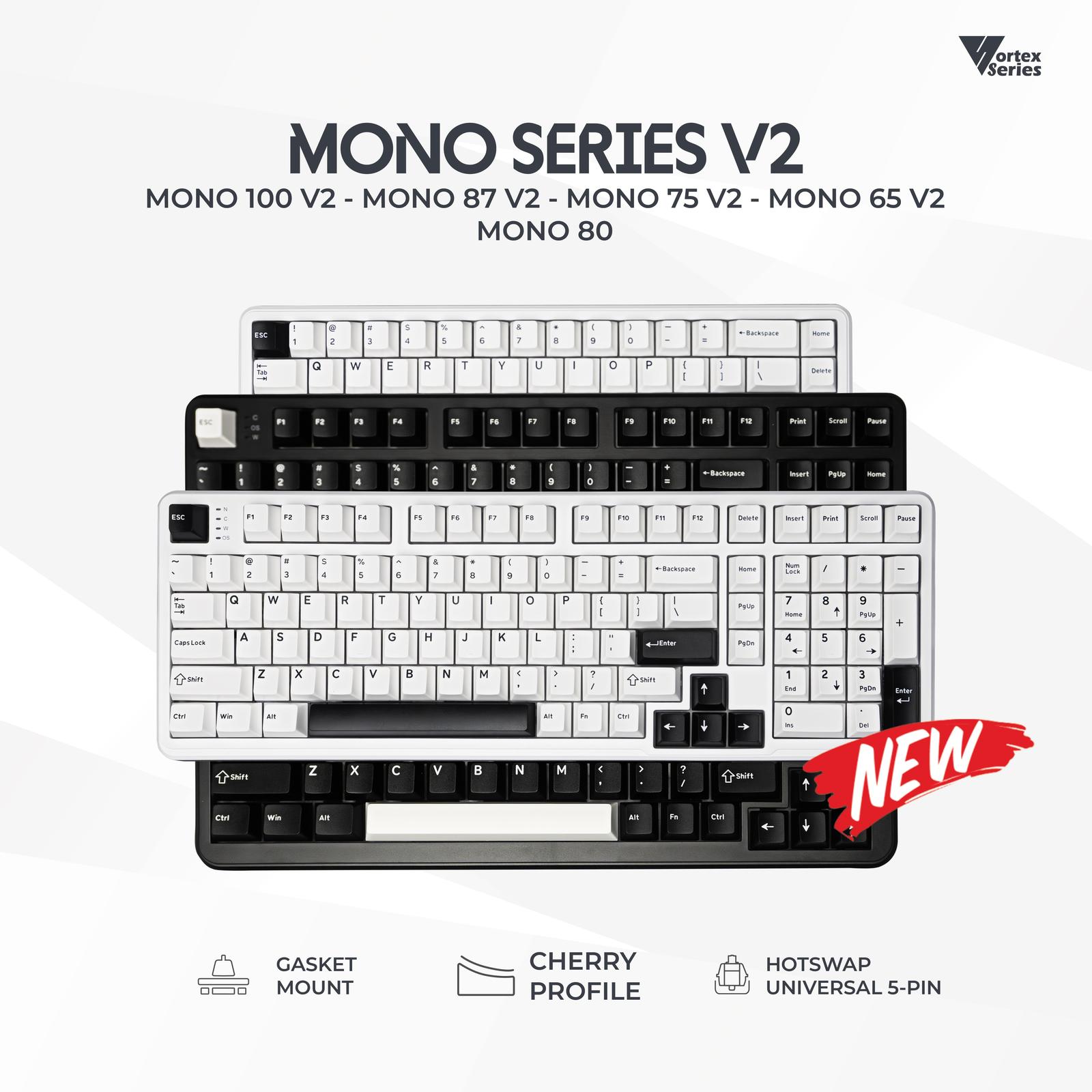 Tersedia dalam dua pilihan warna klasik: White dan Black. Setiap unit sudah dilengkapi dengan keycaps PBT doubleshot Cherry Profile yang tahan lama (kecuali MONO 80 dengan ABS OEM Profile) dan stabilizer yang telah di-tune untuk keystroke yang konsisten dan bebas chatter.