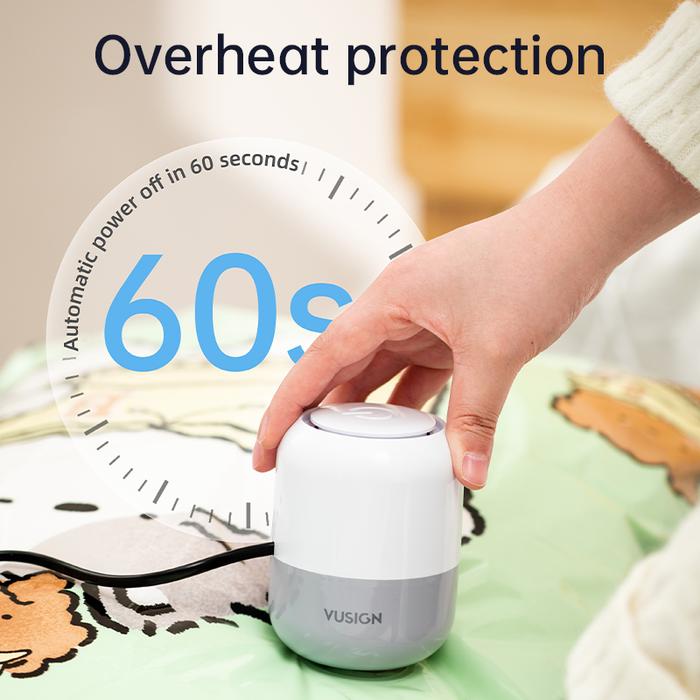 Vusign Electric Vacuum Pump VS600 adalah alat revolusioner untuk mengoptimalkan ruang penyimpanan Anda. Dengan daya hisap kuat 40W, pompa ini secara efisien mengeluarkan udara dari kantong vakum khusus, membuat volume barang seperti selimut, pakaian musiman, atau bahkan mainan anak berkurang secara signifikan. Ukurannya yang kompak (10 x 7.5 cm) dan beratnya yang hanya 195 gram membuatnya sangat portabel dan mudah disimpan. Dilengkapi dengan fitur cerdas perlindungan overheat, motor pompa akan mati secara otomatis jika suhu menjadi terlalu tinggi, sehingga menjamin keamanan dan keawetan produk. Kabel sepanjang 110 cm memberikan keluwesan dalam penggunaan. Desainnya yang intuitif menjadikan proses vakum cepat, mudah, dan praktis untuk kebutuhan rumah tangga sehari-hari.