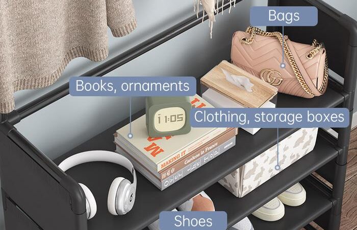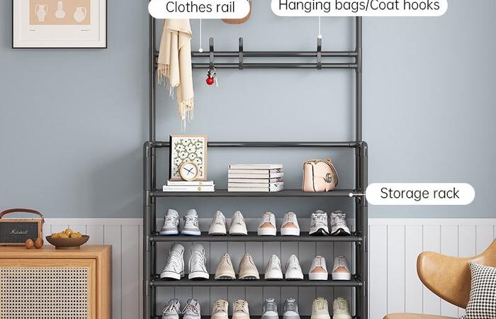 | Fungsi | Rak sepatu 4-5 tingkat dengan gantungan ganda untuk topi/tas |