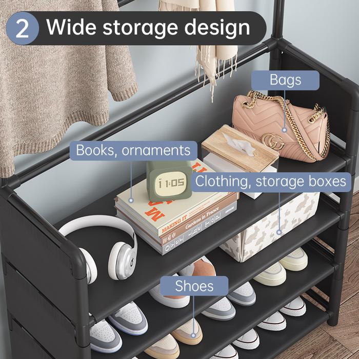 | Fungsi | Rak sepatu 4-5 tingkat dengan gantungan ganda untuk topi/tas |