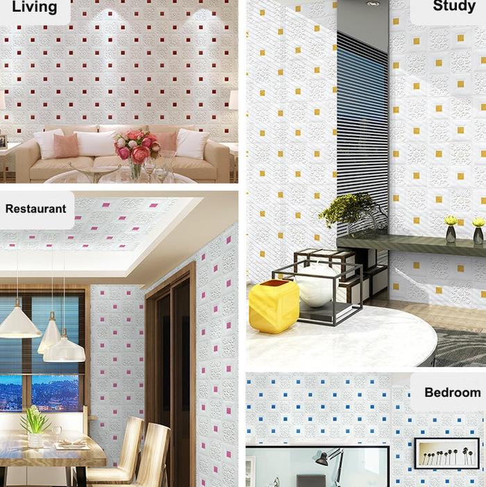 Setiap lembar dilengkapi dengan perekat (lem) pada bagian belakangnya, sehingga Anda tidak perlu membeli lem tambahan. Material foam yang tebal dan fleksibel memudahkan Anda untuk memotong dan menyesuaikannya dengan sudut ruangan. Tersedia dalam dua pilihan ukuran untuk disesuaikan dengan kebutuhan dekorasi Anda.