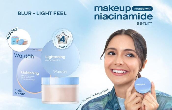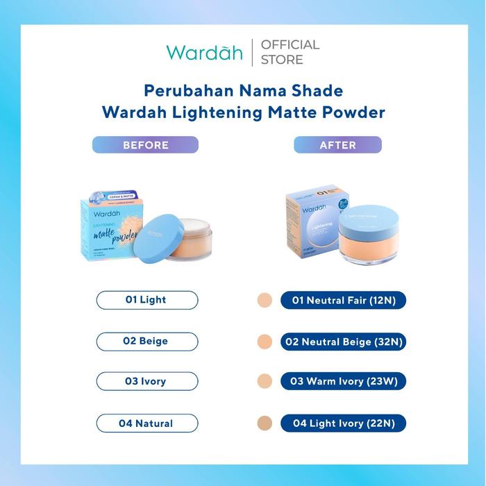 Wardah Lightening Matte Powder hadir dengan inovasi terbaru sebagai Makeup + Skincare yang menggabungkan kecantikan dan perawatan kulit. Dibekali teknologi Airy-Coated Particles™, bedak ini memberikan hasil smooth matte yang merata, menyamarkan tekstur kulit, dan menciptakan tampilan wajah lebih lembut. Dilengkapi SPF 20 PA++ dan Blue Light Protection, produk ini melindungi kulit dari sinar UV dan radiasi layar gadget sepanjang hari.
