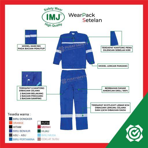 Tingkatkan keselamatan dan kenyamanan kerja dengan Wearpack Setelan Safety dari IMJ. Dirancang khusus untuk pekerja proyek, setelan ini terdiri dari baju dan celana yang terbuat dari bahan American Drill 100% berkualitas tinggi. Bahan ini memiliki ketebalan sedang sehingga tidak mudah robek dan tetap nyaman digunakan dalam cuaca panas karena memiliki kemampuan menyerap keringat dengan baik. Tekstur bahan yang unggul menjamin setelan tidak mudah menyusut setelah pencucian. Fitur keselamatan utama adalah adanya pita Scotlight yang memantulkan cahaya, meningkatkan visibilitas dan keamanan pengguna di lingkungan gelap atau minim cahaya.