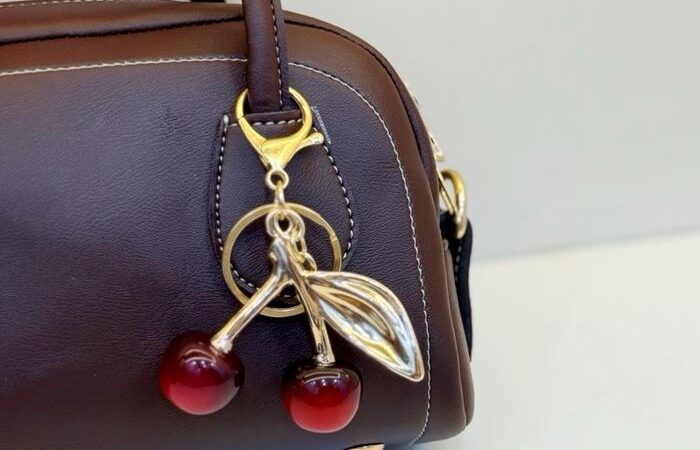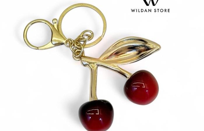 Cherry Charm: Gantungan berbentuk ceri dengan detail mengilap, sering digunakan sebagai aksesori tas kekinian.