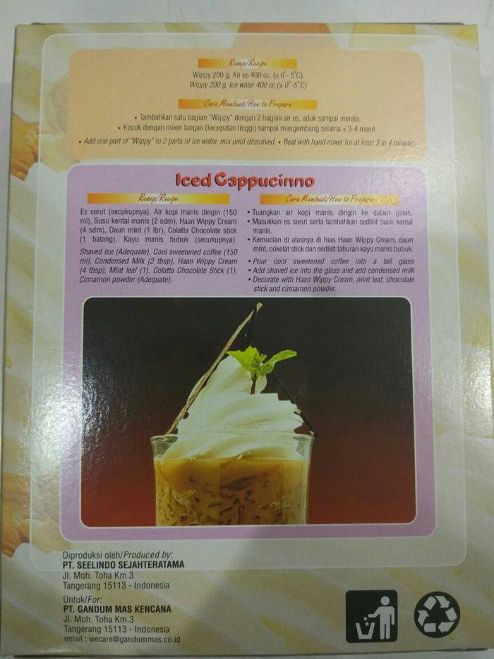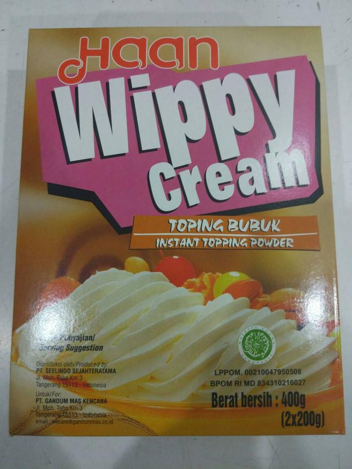 Wujudkan kreasi hidangan penutup yang sempurna dengan Wippy Cream Haan. Produk inovatif ini adalah whipping cream berkualitas tinggi dalam bentuk bubuk yang sangat praktis dan ekonomis. Keunggulan utama produk ini adalah daya simpannya yang jauh lebih lama dibandingkan whipped cream cair, sehingga Anda tidak perlu khawatir produk cepat basi.