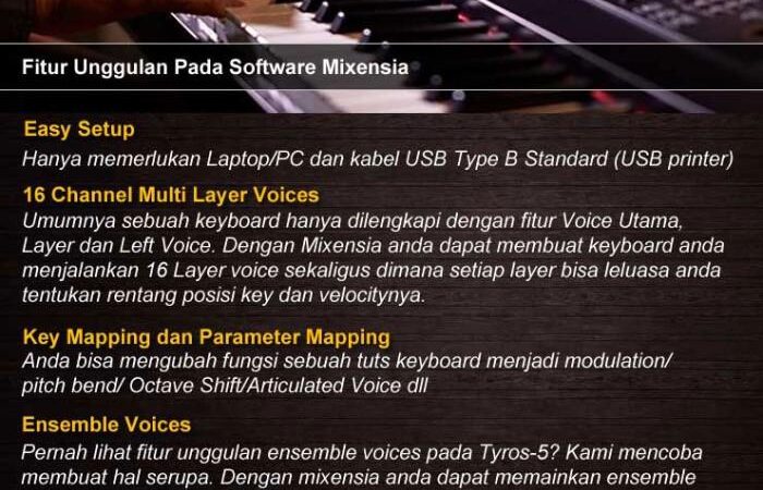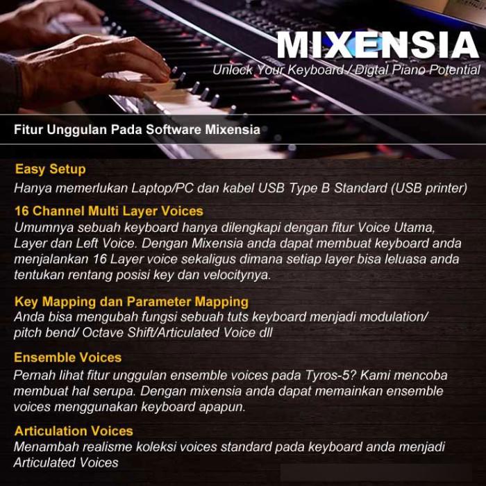 Dapatkan software Mixensia yang akan membuka potensi penuh Yamaha P-145BT Anda. Dengan Mixensia, piano Anda dapat menghasilkan hingga 16 layer suara, articulation voice, dan ensemble voice seperti Tyros 5. Untuk demo dan tutorial lengkap, kunjungi YouTube dan cari kata kunci “Mixensia”.