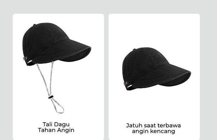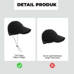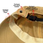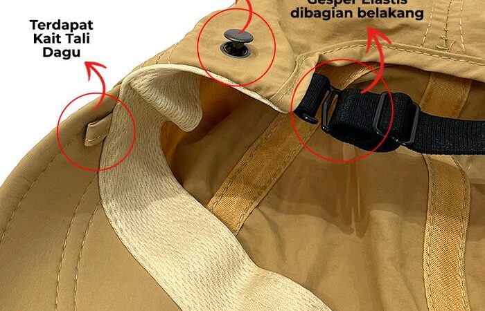 Topi ini dilengkapi dengan fitur pengait tali dagu yang praktis dan bagian belakang dengan gesper karet elastis. Gesper ini memungkinkan Anda menyesuaikan ukuran topi dengan sangat mudah sehingga pas dan nyaman di kepala tanpa khawatir terlalu longgar atau ketat.