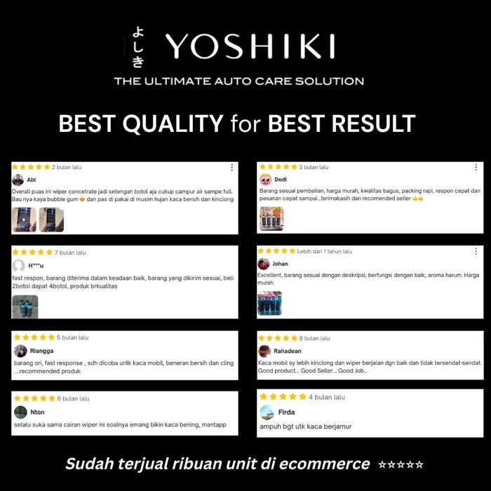 YOSHIKI Wiper Fluid adalah cairan pembersih kaca mobil berbasis teknologi Jepang terkini. Dirancang melalui riset mendalam dan uji laboratorium, produk ini memberikan performa premium dalam membersihkan, merawat, dan memaksimalkan visibilitas kendaraan. Formulasi khususnya juga aman untuk kaca berlapis coating, menjadikannya pilihan ideal bagi pengguna mobil modern.