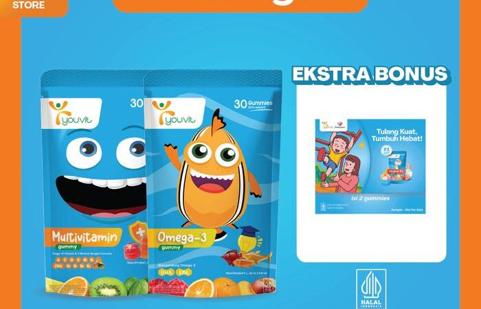 Dukung tumbuh kembang optimal anak dengan Youvit, kombinasi multivitamin dan omega-3 dalam bentuk gummy yang lezat dan disukai anak.