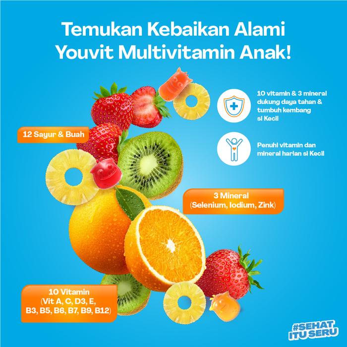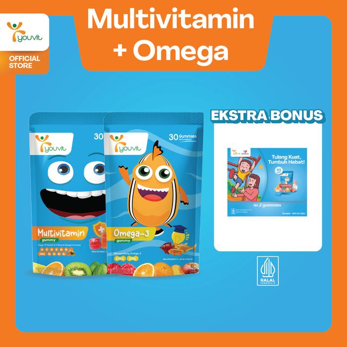 Dukung tumbuh kembang optimal anak dengan Youvit, kombinasi multivitamin dan omega-3 dalam bentuk gummy yang lezat dan disukai anak.