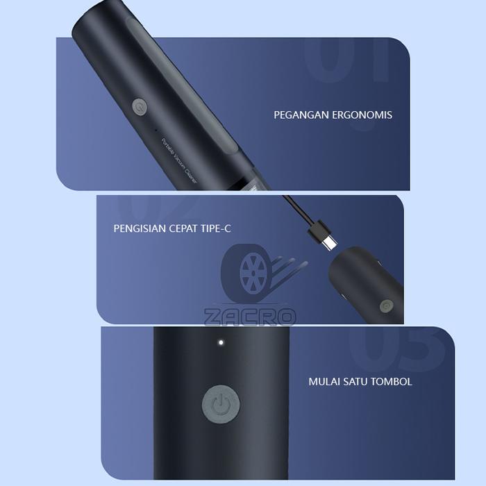 Fitur pengisian USB memudahkan pengisian daya melalui port mobil, power bank, atau laptop. Desain ringkas (285g) dan nirkabel memudahkan penggunaan di mobil, rumah, atau sudut sempit. Dilengkapi multiple nozzle untuk jangkauan lebih luas, termasuk mode tiup untuk membersihkan celah atau mengisi balon.