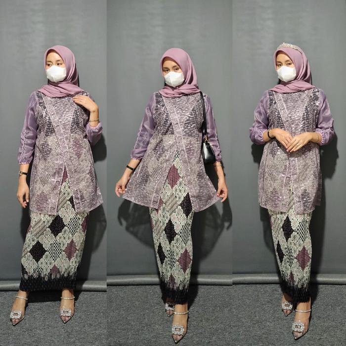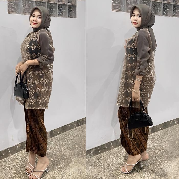 | Outer Dewasa | LD: 110 | PB: 85 | Pjg Lengan: 50 | Lingkar Lengan: 35 | Lingkar Ketiak: 50 | Bahan: Brokat mix Organza Satin |