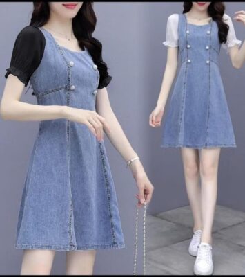 Dress Jeans Wanita Lengan Pendek Kombinasi Sifon