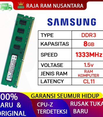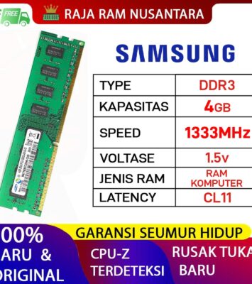 Spesifikasi ProdukDetailMerkSamsungKapasitas4GB (1 keping)TipeDDR3 PC (Desktop)Kecepatan1333MHz...