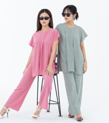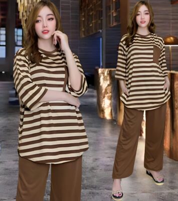 Aufaa Setelan Wanita Oversize: Vistaterry Motif Salur dengan Atasan Oval dan Celana Karet