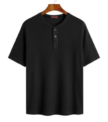 Kaos Pria Polos Crew Neck Kancing 3 Sanghay Lengan Pendek Knitwear Waffle Tebal Cowok