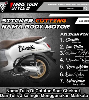 Pasang identitas pribadi pada motor Scoopy Anda dengan Stiker Nama Custom berkualitas tinggi. Stiker ini dibuat khusus...