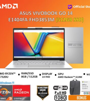 Temukan partner kerja dan hiburan yang sempurna dengan ASUS Vivobook Go 14 E1404FA. Didukung prosesor AMD Ryzen™ 5...