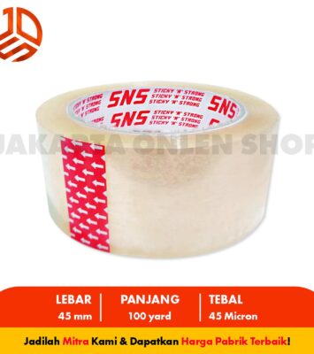 SpesifikasiDetailWarnaBening / CoklatLebar2 Inch / 45 mmPanjang100 Yard / 90 meterKetebalan45 mikronMerkSNS (Sticky N...