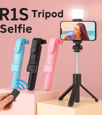 Tripod HP Holder Tongsis R1S dengan LED Flash dan Remote Bluetooth – Panjang 70cm