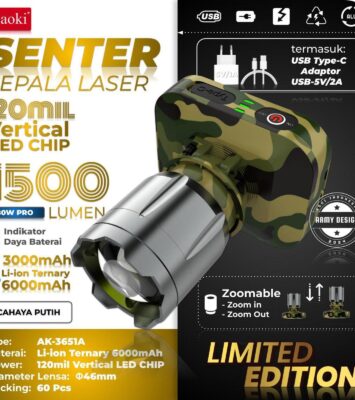Tingkatkan pengalaman petualangan Anda dengan senter kepala AOKI Army Pro, dilengkapi teknologi LED Zoom Laser 80 Watt...