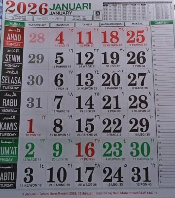 Kalender Dinding 2026 Arab & China Kalender Jawa Pasaran Bulanan